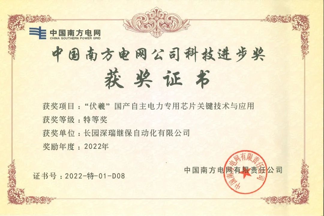 近日,由yabo鸭脖科技集团旗下子公司yabo鸭脖深瑞继保自动化有限公司(以下简称“yabo鸭脖深瑞”)参与的“伏羲国产自主电力专用芯片关键技术与应用”项目荣获中国南方电网公司科技进步奖特等奖。